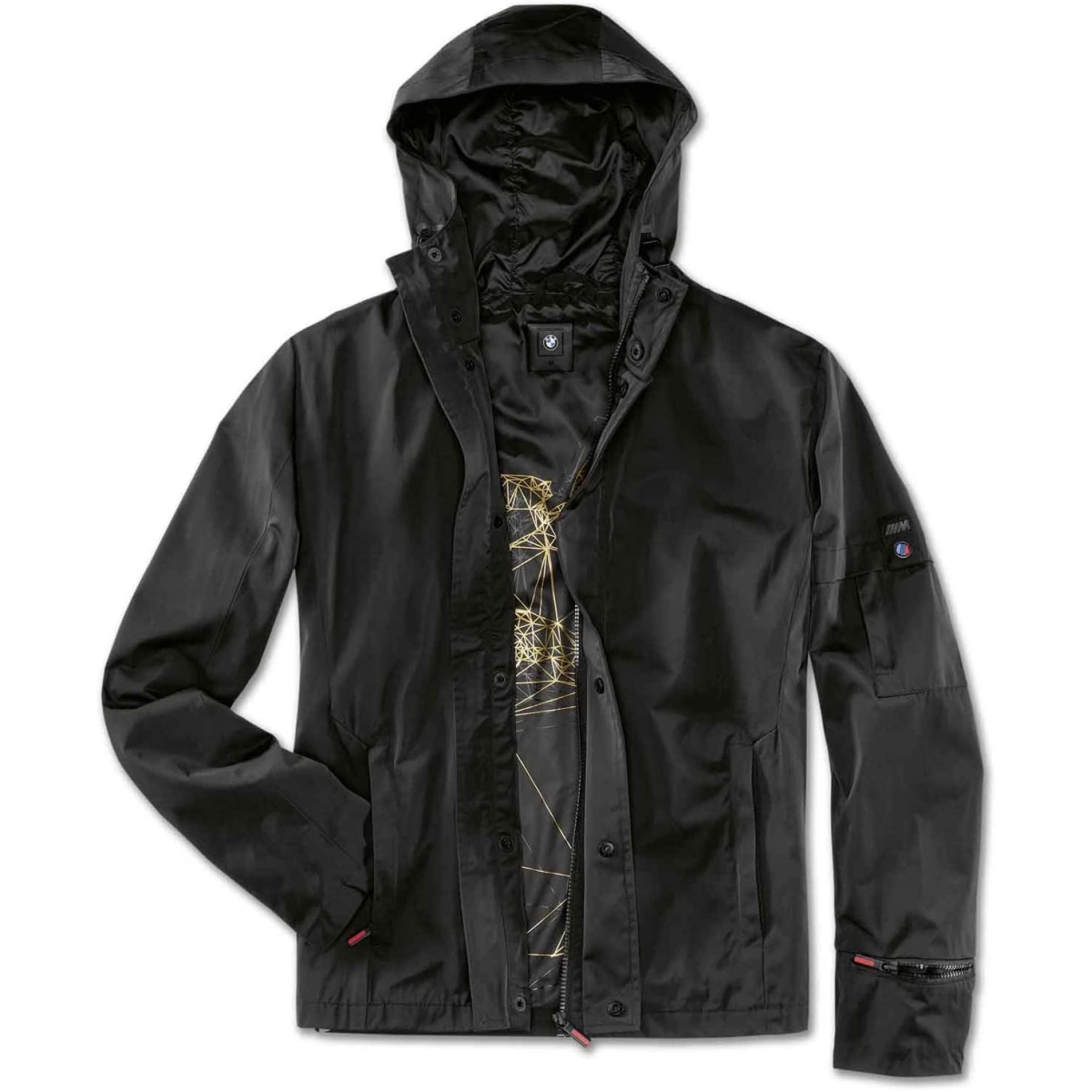 Стильная мужская куртка BMW M с окном для часов в рукаве, на молнии. Графический принт золотистого цвета с контуром спорткара BMW M8 на подкладке. С небольшим удобным карманом на плече. Боковые карманы на молнии, большой капюшон с регулируемым ремешком. Материал: 100% полиэстер. Цвет: черный.