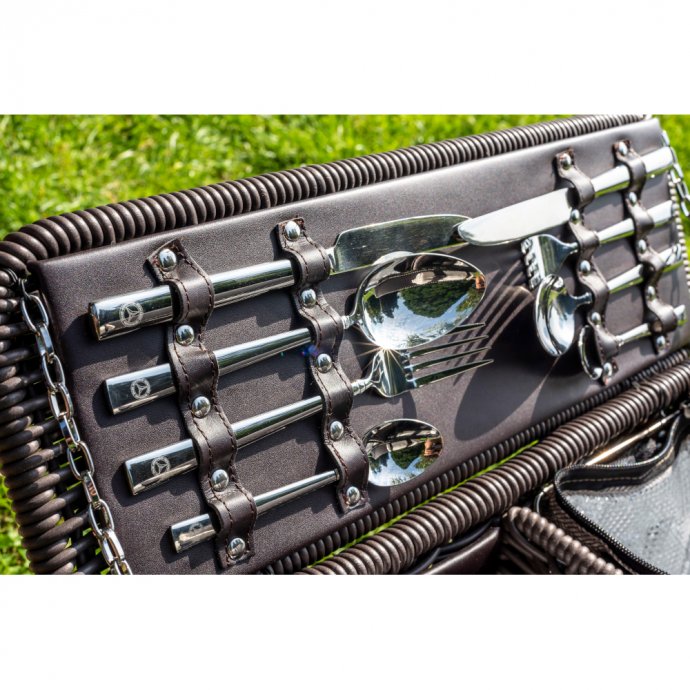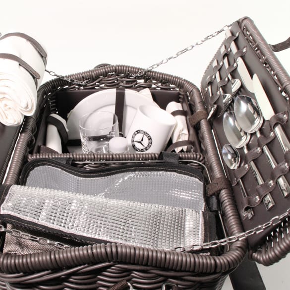 Идеально подходит для обеда на природе: темно-коричневая корзина для пикника из полиуретана впечатляет практичным креплением стаканов, чашек и тарелок с помощью ремешков и застежек на липучках. Это также позволяет безопасно хранить салфетки и скатерть в корзине. Чтобы не дать содержимому выпасть из корзины для пикника при переноске, она имеет прочные крепления и ручки для переноски из натуральной кожи с обеих сторон. Они в сочетании с усиленным ремнем для переноски, выполненным из брезента с наплечником, обеспечивают удобную транспортировку даже на большие расстояния. На боковой стороне корзины имеются два фиксирующих выступа для крепления одеяла для пикника. Специальная термоизоляционная оболочка корзины сохраняет все продукты и напитки холодными и обеспечивает идеальное удовольствие от пикника. Содержимое корзины предназначено для двух человек и, кроме двух высококачественных столовых приборов из четырех частей (ложки, вилки, ножи, чайные ложки) и двух фарфоровых тарелок, также имеет две кофейные чашки, два стакана для сока, солонку и перечницу, две салфетки 40 х 40 см. и скатерть 140 х 140 см. С эмблемами Mercedes. Цвет корзины: темно-коричневый. Материал корзины: полиуретан. Размер корзины: 50 х 34 х 31 см. С этим товаром покупают Ранее просмотрено |