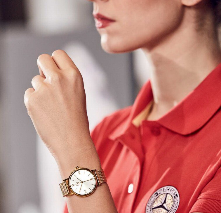 Часы из нержавеющей стали с покрытием PVD золотистого цвета. Серебристый циферблат с римскими цифрами и метками золотистого цвета. Стрелки золотистого цвета. Браслет миланского плетения из нержавеющей стали с покрытием PVD золотистого цвета. Водоне проницаемые до 5 ATM. Диаметр корпуса: 34 мм. Кварцевый механизм Ronda 773. Швейцарский механизм.