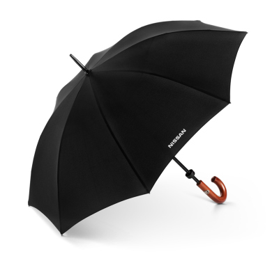 Большой зонт-трость с серебристой надписью Nissan на внешней стороне купола. Длина трости в сложенном состоянии 90 см. Диаметр купола 110 см. Цвет: черный. Открывается и закрывается вручную на фиксаторах. Массивная скругленная ручка коричневого цвета из натурального дерева, в защитной целлофановой оболочке. Производитель: Dr. Koffer, модель "Huntsman 1", по заказу "Ниссан Россия". |